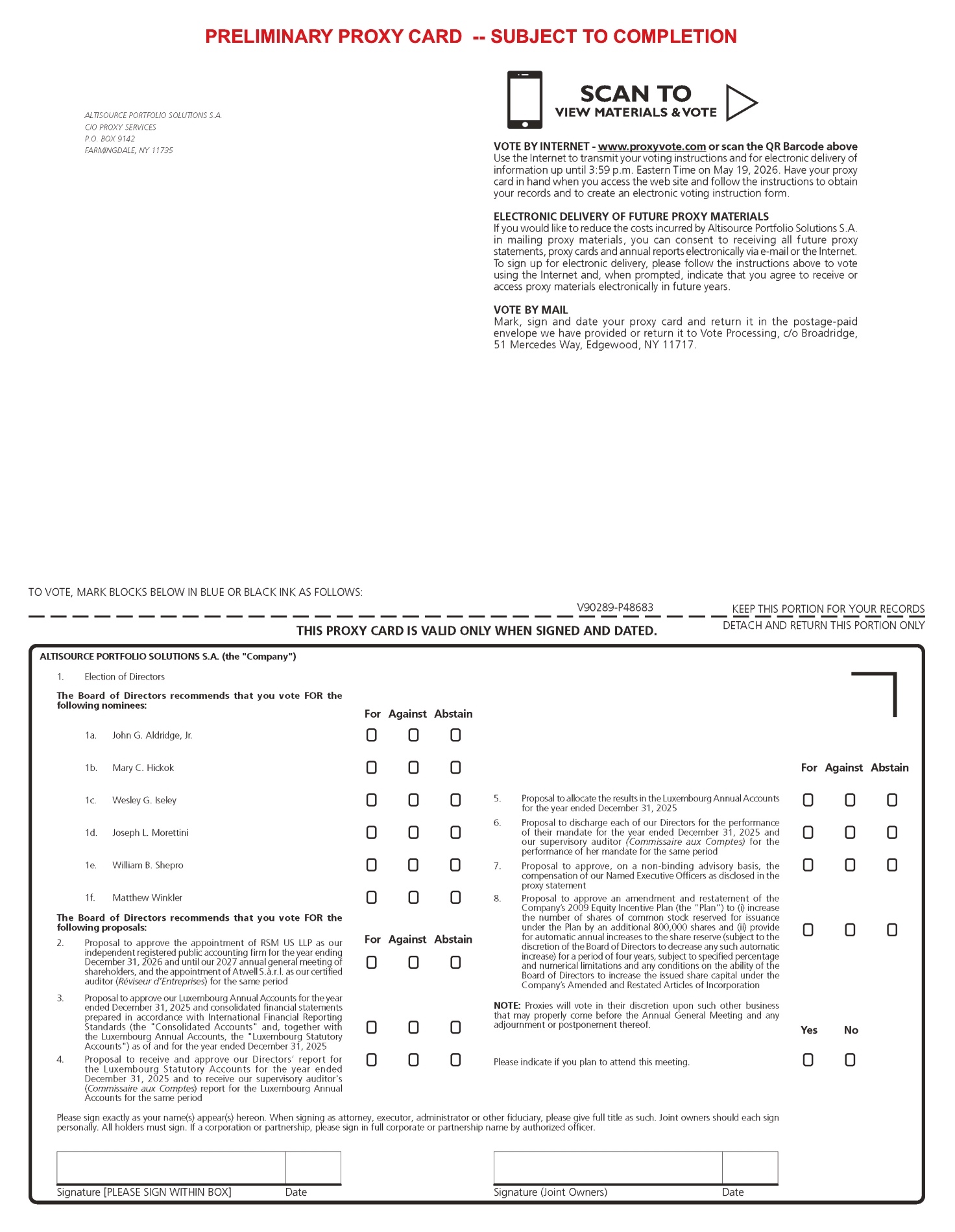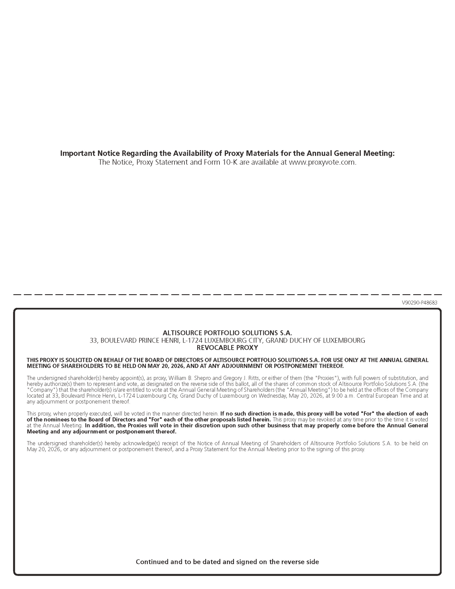 The Nomination/Governance Committee operates under a written charter approved by the Board, which is available on our website at https://ir.altisource.com/corporate-governance and in print upon request. The Nomination/Governance Committee reviews its charter annually and presents any recommended amendments to the Board. The Nomination/Governance Committee also evaluates its performance under its charter and reports to the Board on the results of its evaluation, including an assessment of the charter’s adequacy. The Nomination/Governance Committee last reviewed its charter in December 2025. The Nomination/Governance Committee met five (5) times in 2025.